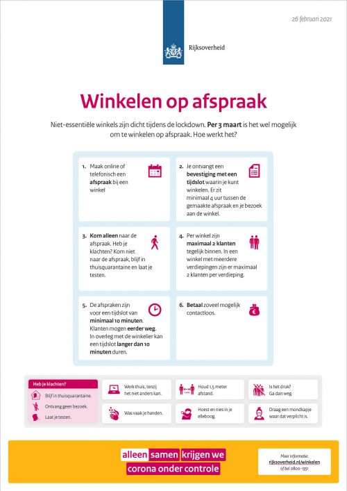 Vanaf 3 maart is winkelen op afspraak mogelijk.